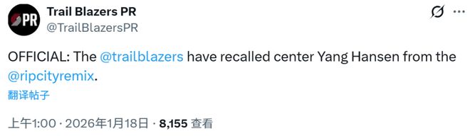 - 开拓者官宣召回杨瀚森!今日有望出战湖人 近两场G联赛场均18+12